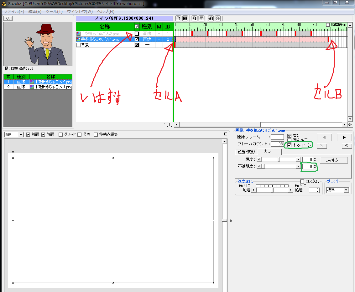 そしてトゥイーンの左下にあるカラーのボックスで明度や不透明度をいじれるので今回はセルAの不透明度を0%にします